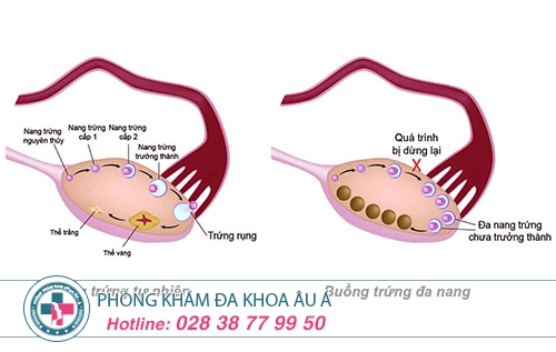 Buồng trứng đa nang gây ra do sự mất cân bằng nội tiết của phụ nữ. Khi đó, buồng trứng của người phụ nữ sản xuất ra androgen nhiều hơn bình thường. Nồng độ nội tiết tố cao sẽ ảnh hưởng tới sự phát triển và phóng thích noãn (rụng trứng).